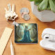 Eine wunderschöne Fee mit einem türkisfarbenen Kleid und eine Halskette aus türkisfarbenen Steinen mit türkisfarbenem, lang türkisfarbenem Haar und eifrigen, drachenartigen Flügeln mit einem holzigen Zweig steht in einem zauberhaften Wald, umgeben von Gras, Felsen und von Weinbäumen bewachsenen Bäumen.