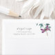 Dieses Adressetikett zeichnet sich durch eine wunderschöne Aquarelllibrücke aus, deren Flügel in lila- und rosa Farbtönen gehalten sind. Es befindet sich in einer einfachen Anordnung von Grünpflanzen in natürlichen Aquarellen in Grün- und Blautönen auf weißem Hintergrund.