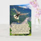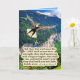Schöne Eagle Scripture Card einer farbenfrohen, detailreichen Szene mit einem prächtigen Bald Adler, der seine Flügel ausbreitet und hoch in den blauen Himmel über einem üppig grünen Tal am Fuße eines Berges fliegt. Diese Szene begleitet den Bibelvers: "Aber diejenigen, die auf den Herrn warten, werden ihre Kraft erneuern; sie werden sich als Adler mit Flügeln erheben; sie werden laufen und nicht erschöpft sein; und sie werden laufen und nicht ohnmächtig sein." Isaiah 40:31. Diese Karte ist ein wunderbares Geschenk oder kann benutzt werden, um uns an das Wort Gottes zu erinnern.