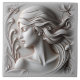 Eine schön detaillierte Darstellung einer Frau. Ihr Haar fließt in sanften, komplizierten Wellen und schafft ein Gefühl von Bewegung und Fluidität. Der weiche Farbton verleiht dem Stück eine ätherische, fast weltliche Qualität, da das Licht sanft von der Oberfläche reflektiert und subtile Schatten ausstrahlt, die die Kunst des Designs hervorheben. Die Kanten der Kachel verblassen, die Szene wird mit einer sauberen, neutralen Farbe eingerahmt. Das Ganze wirkt einladend und eindrucksvoll und verbindet klassische Schönheit mit modernem Kunsthandwerk.