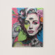 Eine schöne Frau mit farbenfrohen Haaren, Tattoos und einer AI aus dem dritten Auge hat Kunst geschaffen