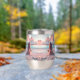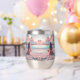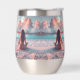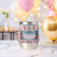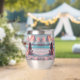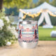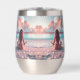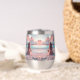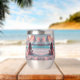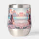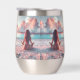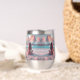 Schöne Frau meditieren auf einem Strand mit weißem Sand und glänzenden Meerglas. Rosa und blau flauschige Wolken und blass blaues Wasser.