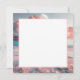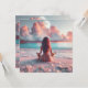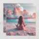 Schöne Frau meditieren auf einem Strand mit weißem Sand und glänzenden Meerglas. Rosa und blau flauschige Wolken und blass blaues Wasser.