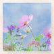 Schöne rosa Blumen und Lavendelwiese an einem hellen Frühlingstag vor blauem Himmel.