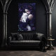 Schöne gotische Frau und ihr weißes Katzen Poster. © Dunkles Herz Wünsche. Dieses Plakat hat eine wunderschöne Gotikerin mit lila Haar, die sich zwischen Blume und Schmetterlingen in ihre weiße Katze knupfen lässt.