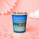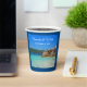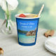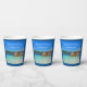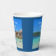 Papiertassen mit einem Foto eines türkisblauen Strandes mit großen Felsen, die an der Küste verstreut sind. Helle und sonnige tropische Lage.