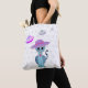 Einzigartige Tasche mit einer schönen Katze in einem Hut und fliegenden Untertassen nur auf der Vorderseite auf dem sternweißen Hintergrund. Die himmlische Katze ist hellblau und trägt einen violetten Hut.