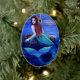 Ovale Weihnachtsverzierungen, eine schöne Meerjungfrau isst Hummer auf den Seefelsen am Sonnenuntergang zu Abend. Ovale Weihnachtsverzierung von der Fantasiekunst Malerei "das Abendessen der Meerjungfrau" durch Sue Halstenberg.
