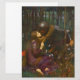 Dieses Design zeigt ein Gemälde des englischen Pre-Raphaelite Künstlers John William Waterhouse (1849-1917). Es zeigt eine attraktive Frau in einem mittelalterlichen Wald. Neben ihr kniet ein Ritter in Rüstung nieder. Sie umwickelt ihr langes braunes Haar um den Hals und bringt ihn naher zu ihr, wie er liebevoll in die Augen sieht. Sie trägt ein lila Kleid und hat bloße Füße. Um sie herum sind Blume verstreut. Der Ritter sieht verblüfft, aber von der Schönheit der Frau verzaubert aus. Die Szene basiert auf einer Ballade des englischen Dichters John Keats namens "La Belle Dame sans Merci" [Die schöne Dame ohne Gnade]. Das Gedicht handelt von einer Fee, die einen Ritter zu einem unangenehmen Schicksal verurteilt, nachdem sie ihn mit ihren schönen Augen und ihrem Gesang verführt hat. Das Originalwerk wurde 1893 von John William Waterhouse gemalt.
