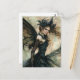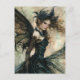 Schöne Fee mit einem dunkelgrünen und schwarzen Kleid, sie hat wunderschöne schwarze Spitzen Flügel, lange fließende Haare, spitzen Ohren und dunkelgrüne Federn in ihrem Haar.