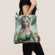 Eine wunderschöne, weiße haarige Fee mit blassgrünen Flügeln, die ein hübsches, grünes Kleid tragen, und smaragdgrünen Ohrringen halten einen kleinen Haufen Lilien des Tales und stehend in einem Gebiet von Lilien des Tales. Der Text kann leicht geändert oder gelöscht werden, wenn Sie das Bild ohne Text wünschen.