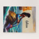 Eine holende Meerjungfrau sitzt auf einem Felsen und sieht zu, wie ein Schiff vorbeisegelt.