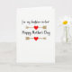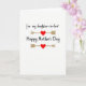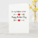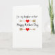 Diese Karte zeigt einen weißen Hintergrund mit schwarzer, fließender Schrift, die sich sanft und nah anfühlt, wie eine stille Notiz zwischen Familienmitgliedern ❤️. Oben stehen die Worte „für meine Schwiegertochter“ zentriert in einer leichten, kursiven Linie, was dem Layout einen sanften, intimen Anfang gibt. Darunter erscheint „Alles Gute zum Muttertag“ größer und runder in der Mitte, was als Hauptbotschaft hervorsticht, ohne den Raum zu überfüllen. Auf beiden Seiten des mittleren Bereichs zeigen zwei schlanke horizontale Pfeile in einem gedämpften Goldton nach innen und lenken den Blick, als ob sie zwei Menschen zusammenbringen. Dort, wo die Pfeile sich treffen, sitzt ein reiches rotes Herz in der Mitte, was eine romantische Note hinzufügt, die wie direkt an sie gerichtete Zuneigung wirkt. Kleine rote Herzformen wiederholen diese Wärme und balancieren die goldenen Akzente aus, wodurch der Look süß statt formell bleibt 🌼. Der Abstand bleibt offen und luftig, wobei der Text ordentlich über dem Pfeil-Herz