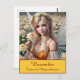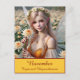 Eine wunderschöne goldhaarige Fee mit goldenen und durchsichtigen Flügeln, die ein hübsches topaz-farbenes Kleid und Topaz-Schmuck tragen, hält ein Single-Chrysanthemum, während sie in einem Bereich von Chrysanthemen stehend ist.
