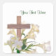 Dieses schöne Ostern-Ausrüstungsbeschreibungen ausgezeichnete Osterlilien und ein hölzernes Kreuz. Seien Sie sicher, unsere anderen Produkte zu sehen, diesen Entwurf, einschließlich Rücksendeadressen-Aufkleber, Porto-Briefmarken, Küchenmagneten, Verzierungen, Halsketten, Kaffee-Tassen und mehr zusammenzubringen!