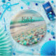 Schöne blaue und aquamarine Ozeanwellen mit blauem Himmel und Wolken, ein weißer Sandstrand mit grünem und blauem Meerglas. Fügen Sie die Initialen und das Hochzeitdatum in den personalisierenden Bereich ein.