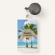 Ein Namensschild mit einem schönen und ruhigen Foto von 2 Palmen unter einem strahlend blauen Himmel. Stehend an einem abgeschiedenen tropischen Strand mit türkisblauem Wasser.