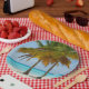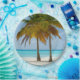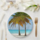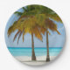 Teller aus Papier mit einem schönen und ruhigen Foto von 2 Palmen unter einem hellblauen Himmel. Stehend an einem abgeschiedenen tropischen Strand mit türkisblauem Wasser.