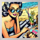 Eine liebevolle Dame am Strand mit einem Magazin aus der Mitte der 50er Jahre, einem Limonadencocktail und einer Sonnenbrille. Retro Pop Art Comic buchen Stil ai art.