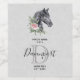 Personalisierte Flaschenetiketten mit einer schönen Abbildung eines schwarzen Pferdekopfes mit extravaganter Blumendekoration am Hals. Elegante und klassische Tiermalerei. Grauer Hintergrund.