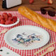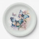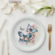 Papier Teller mit einem Trio von Schmetterlingen, die zwischen einigen hübschen Blume flattern. Die Farbe Blau Rosa und Grün.