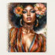 Dieser farbenfrohe Planer zeichnet sich durch eine lebendige Aquarellbilder einer schönen schwarzen Frau aus, die mit Vintager Mode aus den 70er Jahren eine üppige Figur trägt. Sie hat Blume in ihren dicken Haaren und trägt große goldene Ohrringe und einen komplizierten Schoker. Blumenretro-Kunstwerk eines melaninreichen afroamerikanischen oder anderen diaspora Schönheit. Ideal für Fans von kühnen Rücken-Look und afrozentrischen kulturellen Stolz.