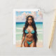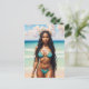 Auf dieser Postkarte finden Sie Ölgemälde eines schönen Schwarzen Mädchens mit langen Haaren in Drehungen oder Locs, die eine aquamarine Bikini- und Blume-Krone tragen. Sie ist am Strand, hinter ihr liegt das Meer.