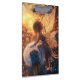 Dieses bezaubernde Bild zeigt eine wunderschöne, ätherische Sonnenfee mit leuchtenden Flügeln, die sanft einen großen Lüster berühren. Das warme, goldene Licht schafft eine zauberhafte und ruhige Atmosphäre.
