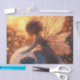 Dieses bezaubernde Bild zeigt eine wunderschöne, ätherische Sonnenfee mit leuchtenden Flügeln, die sanft einen großen Lüster berühren. Das warme, goldene Licht schafft eine zauberhafte und ruhige Atmosphäre.