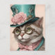 Eine schöne, graue Steampunkkatze in einem blauen Hut mit rosa Blume