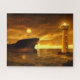 Nautische Szene mit Leuchtturm bei einem orangefarbenen Sonnenuntergang. frontiernow.com