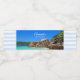Party-Flaschen-Etiketten mit einem Foto eines türkisblauen Strandes mit großen Felsen, die an der Küste verstreut sind. Helle und sonnige tropische Lage.