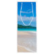Eine Geschenktasche mit einem Foto von einem herrlichen Urlaubsort. Hellblauer Himmel, sanfter Sandstrand mit kristallklarem Wasser. Ein üppig bedeckter Berg im Hintergrund. Landschaftliche und ruhige Fotografie.