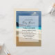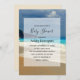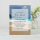 Baby Dusche Einladung mit einem schönen Foto mit einem türkisblauen Meer und einem Sandstrand mit Bergen im Hintergrund.
