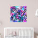 Ein lustiger kleiner Vogel in der oberen links Ecke und Blumenelemente auf einem rosa, lila und türkisfarbenen Hintergrund.