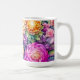Hübsche Blumenkaffee-Tasse in Wasserfarbe. Peonies und andere Blume in Pfirsich, Korallen, lila und lila.