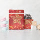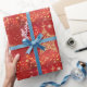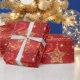 Hübsche Weihnachtsverpackung mit goldmetallischem Stern, funkelnden Sternen und Glitzer auf Rot.