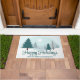 Eine wunderschöne Winterlandschaft mit aquamarinen grünen Pinienbäumen und schneebedecktem Boden auf einer personalisierten Urlaubsmatte. Passen Sie die Happy Holidays Dekoration mit Ihrem eigenen Firmennamen an.