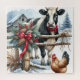 Hübsche schwarz-weiße Kuh mit rotem Bug und niedlichem Hahn. Im Hintergrund gibt es eine rote rustikale Scheune und einen Holzzaun, der in der Weihnachtsgarage dekoriert ist. Eine hübsche Aquarellszene eines schneebedeckten Wintertages auf dem Bauernhof.