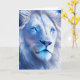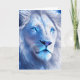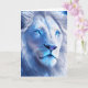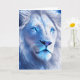 Leere Karte. Schöne ai Kunst, die einen weißen mystischen Löwen mit blauen Augen darstellt. Schöne Fantasiekunst. Surrealer Löwe.
