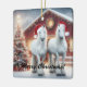 Schöne Weiße Pferde mit einer Weihnachtsmannmütze mit einem beleuchteten Weihnachtsbaum und rustikale rote Scheune Keramik Ornament bringen viel mehr Feiertagsstimmung zu Ihrem Baum mit einem maßgeschneiderten Keramik-Ornament. Füge deine liebsten Fotos, Bilder und persönlichen Nachrichten hinzu. Du kannst beide Seiten des Ornaments selbst gestalten. Die goldene Schnur hilft dir dabei diesen Schmuck aufzuhängen und deine Erinnerungen perfekt zu präsentieren.