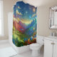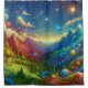 Eine sehr bunte und mystische Abbildung von Bergen, Bäumen und dem Sternenhimmel.
