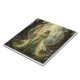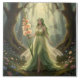 Eine wunderschöne Fee mit einem fließenden, hellgrünen Kleid und Schmuck aus Peridoten mit Peridot Steinen in ihrem langen, hellgrünen Haar und transluzenten Drachenfliegenflügeln mit einem Gladiolus Spaziergänge in einem zauberhaften Wald umgeben von rosa und blauen Blumen und rebenbedeckten Bäumen.