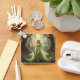 Eine wunderschöne Fee mit einem fließenden, hellgrünen Kleid und Schmuck aus Peridoten mit Peridot Steinen in ihrem langen, hellgrünen Haar und transluzenten Drachenfliegenflügeln mit einem Gladiolus Spaziergänge in einem zauberhaften Wald umgeben von rosa und blauen Blumen und rebenbedeckten Bäumen.