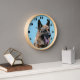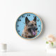 Diese Runde zeigt ein Foto des Kopfes eines sehr gut aussehenden deutschen Schäferhundes. Der Hintergrund ist blau und die Uhr hat eine tiefere blaue Grenze, und schwarze Zahlen. Deutsche Schäferhunde werden auch als Alsationshunde bezeichnet.
