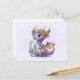 Postkarte mit einer Illustration eines mythischen Drachens. Lila und blaue Waage. Eine geblümte Goldkrone mit Hörnern schmückt den Kopf. Magisch, lustig und freundlich.