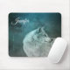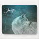 Ein Mauspad mit einem Foto eines zauberhaften zorngrauen Wolfs. Im Hintergrund ist ein dunkler Wald mit Bäumen. Magisches mystisches Flair.