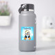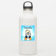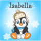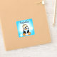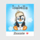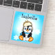 A cute funny hand drawn cartoon penguin with snowballs and snowflakes background. Personalized name stickers.