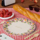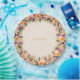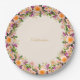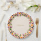 Schöner Kronkranz aus Blume in Weiß & Violett auf dem beige sandfarbenen Papierteller. Text kann personalisiert sein. Ideal für Hochzeit, Geburtstag, Jubiläum und andere Veranstaltungen.