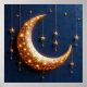 Das Bild zeigt einen wunderschön beleuchteten Halbmond, der mit funkelnden Lichtern geschmückt ist. Der Mond wird vor einem tiefen, blau strukturierten Hintergrund platziert und schafft so ein nächtliches Himmelsambiente. Vom Mond hängen mehrere kleine, leuchtende Sterne, die jeweils die gleiche goldene Farbe widerspiegeln. Der Effekt ist magisch und skurril und erinnert an eine ruhige Nachtszene, die mit funkelnden himmlischen Elementen gefüllt ist.